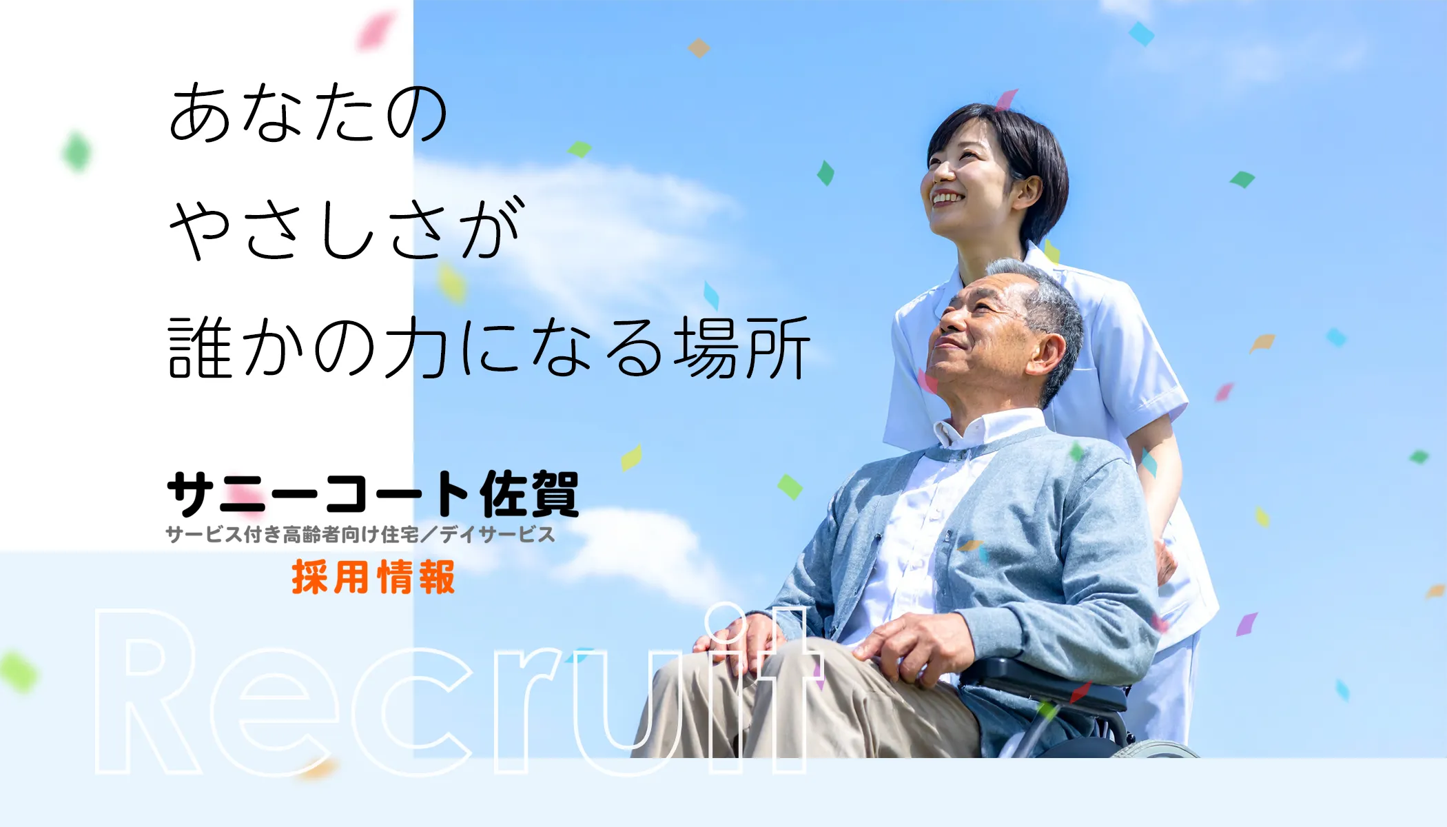 あなたに寄り添い、想いを共有する仲間が待っています。サニーコート佐賀では、経験や資格よりも「誰かのために心を尽くしたい」というやさしい気持ちをお持ちの看護師さんを募集します。